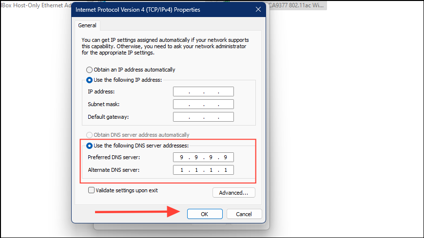 9.9.9.9, and in the 'Alternate DNS Server' option, type1.1.1.1.