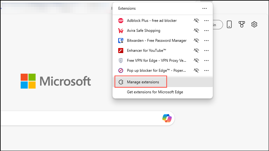 - All installed extensions will show up, along with a 'Manage Extensions' button. Click on it.