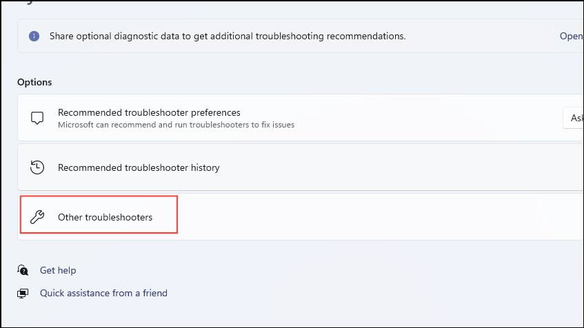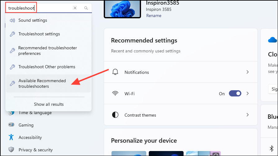 troubleshootin the search box on the upper left, and click on the 'Available Recommended Troubleshooters' option.