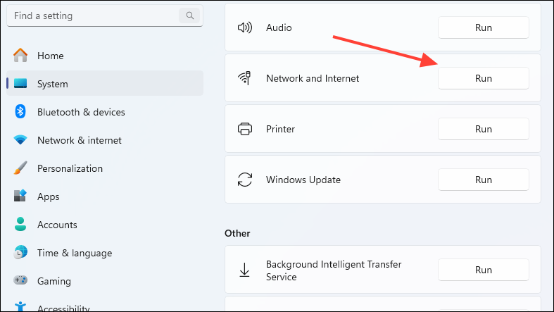 - You will see all available troubleshooters on the next page. Click on the 'Run' button to the right of the 'Network and Internet' option.