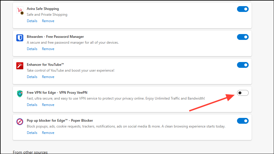 - Locate your VPN among the extensions and click on the button to its right to turn it off.