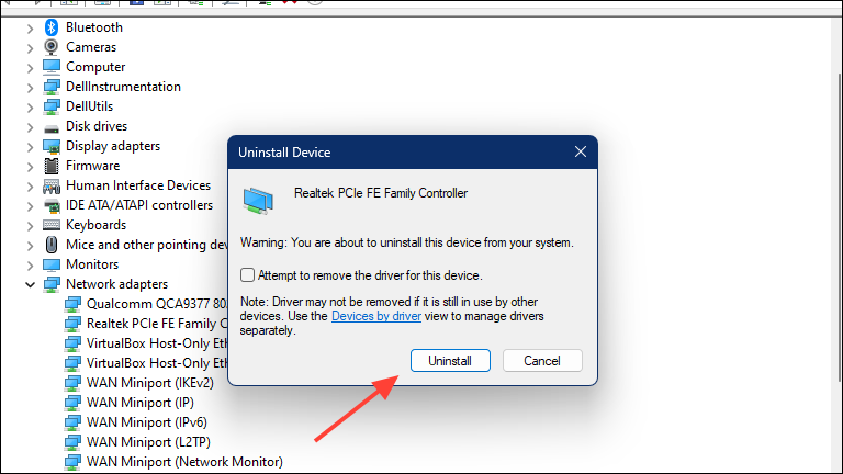 - Open the Device Manager, right-click on your network device, and click on the 'Uninstall Device' option.