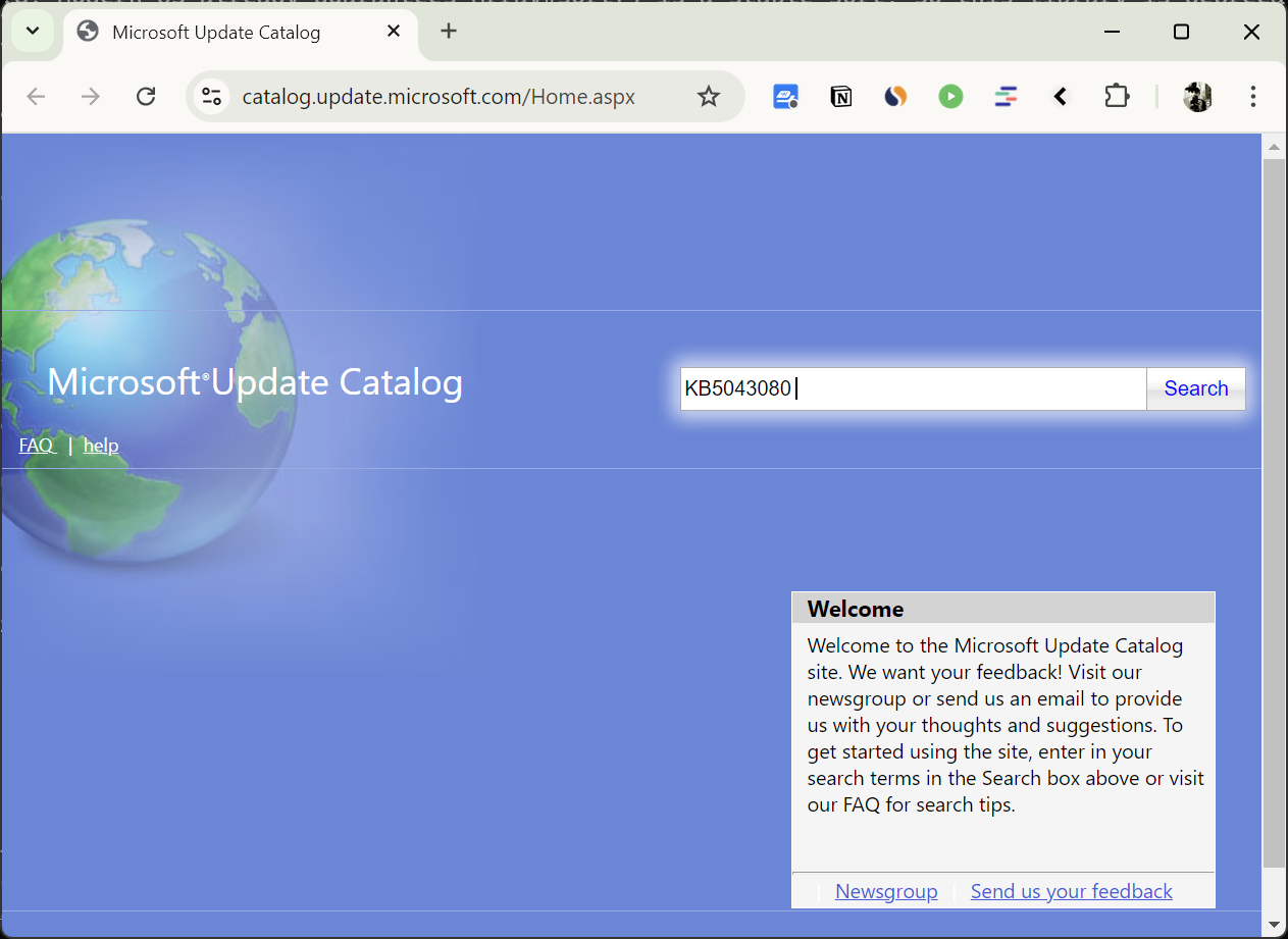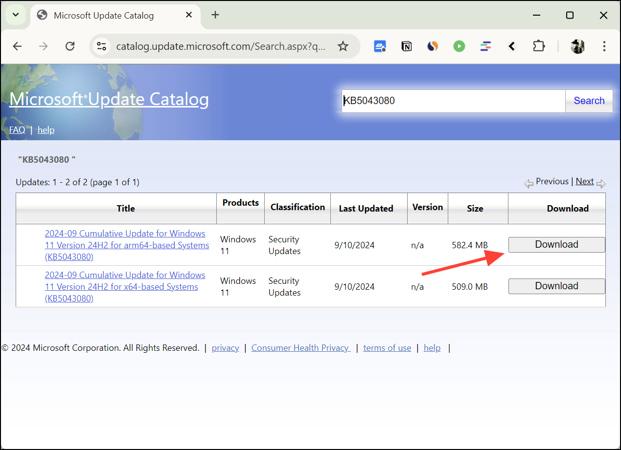 - In the search box, enter the KB number of the latest update (e.g., 5043080 for September 2024). Then, click the "Search" button.