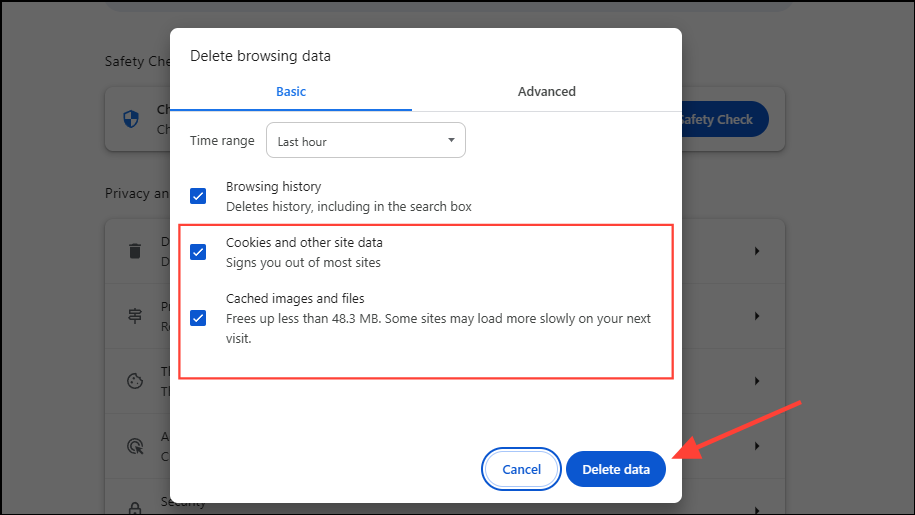 - Then click on the 'Cookies and other site data' and 'Cached images and files' checkboxes to select them and then click on the 'Delete data' button. You can also select the time range for which you want to delete the data using the dropdown menu at the top.