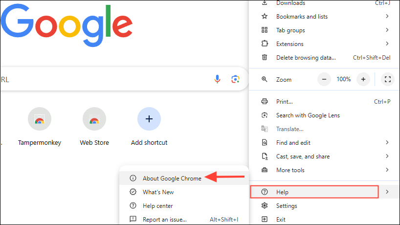 - Now go to 'Help' in the dropdown menu and then click on 'About Google Chrome'.