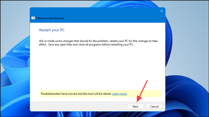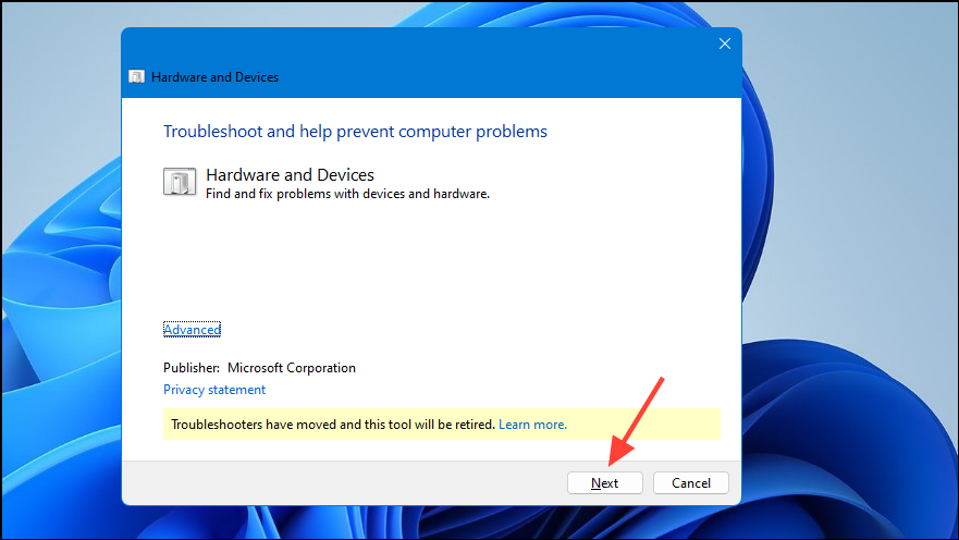 - When the Hardware and Device Troubleshooter opens, click on the 'Next' button.