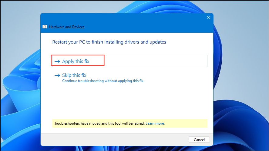 - Let the troubleshooter run and then click on 'Apply this fix'.