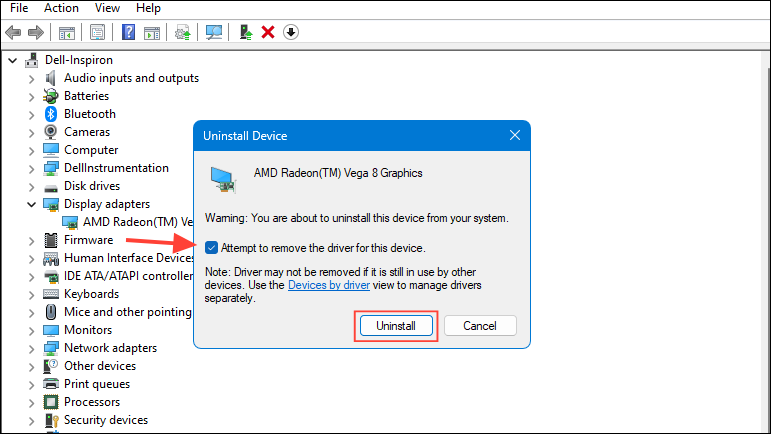 - In the pop-up that appears, click on the checkbox for 'Attempt to remove the driver for this device' and then click on the 'Uninstall' button.