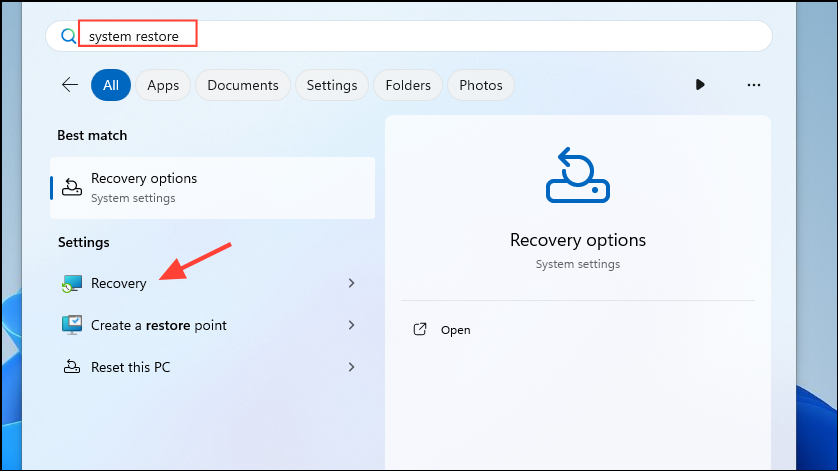system restoreand click on 'Recovery'.