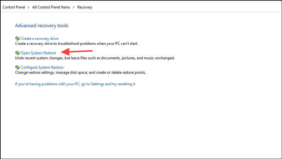 - Next, click on 'Open System Restore' in the window that appears.
