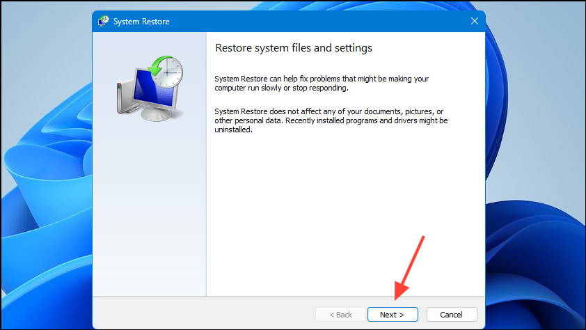 - Click on the 'Next' button when the System Restore dialog box opens.