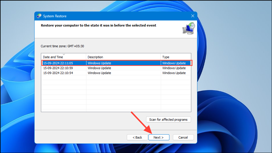 - You will see all available restore points and click on any one to select it. Then click on the 'Next' button at the bottom.