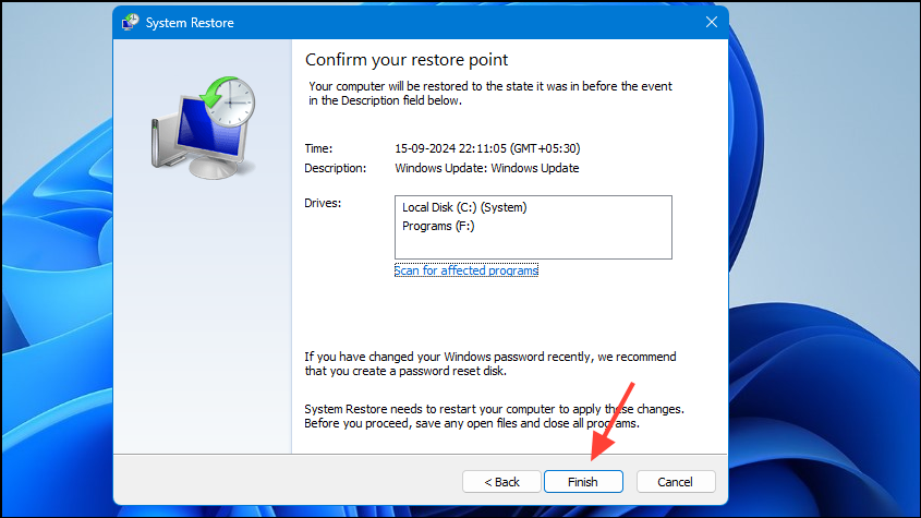 - Finally, click on the 'Finish' button and your computer will restart and go back to the selected restore point.