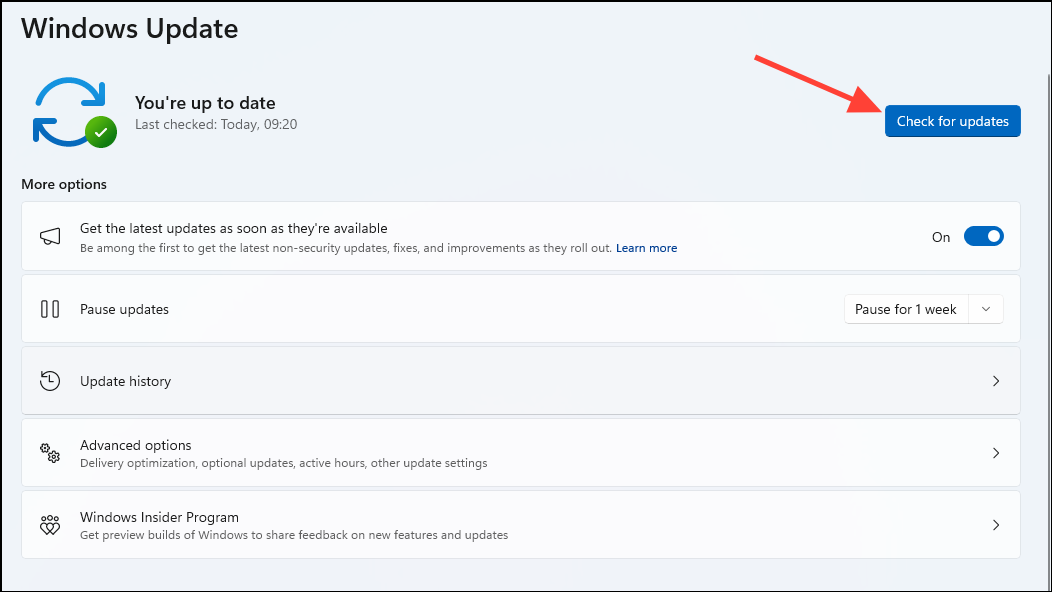 - Once the Windows Update page opens, click on the 'Check for updates' button.