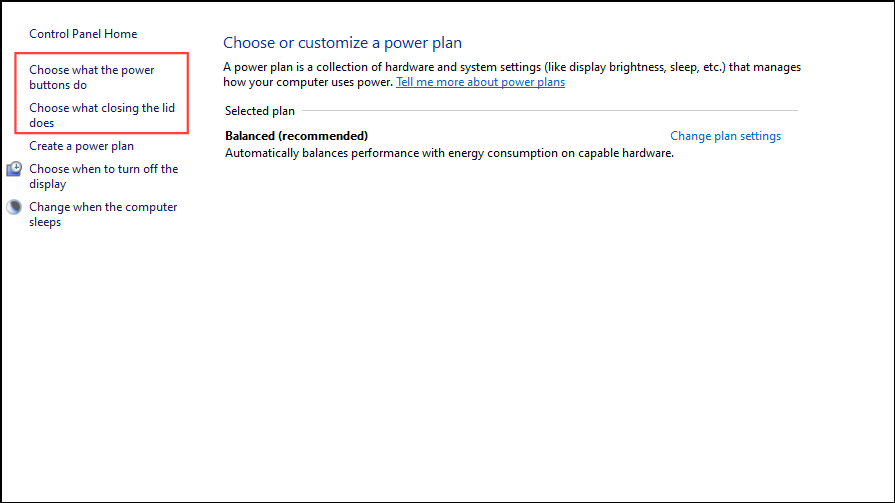 - Once on the Power Options page, click on 'Choose what the power buttons do' or 'Choose what closing the lid does'.