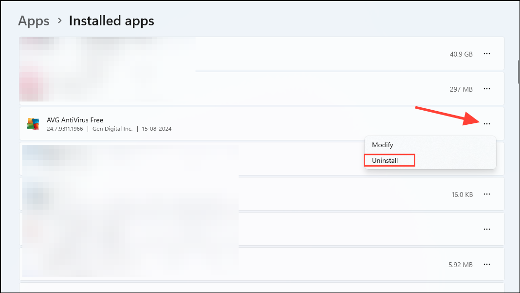 - When the list of installed apps appears, search for your antivirus program. Once you find it, click on the three dots on the right and then on 'Uninstall'.