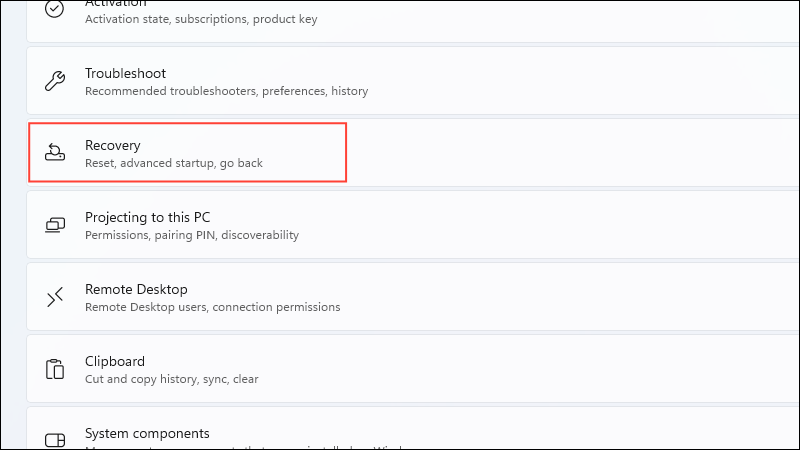 - Then click on 'Recovery' on the System page.