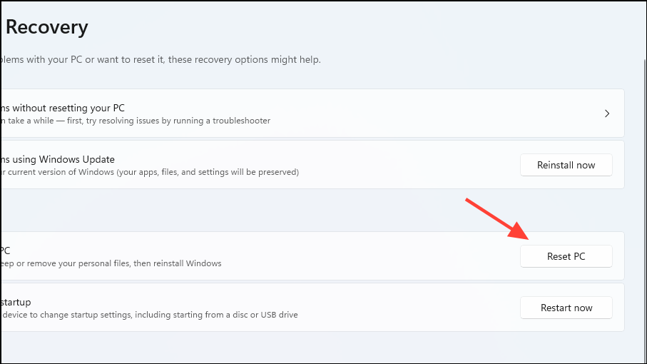 - On the next page, click on the 'Reset PC' button on the right.