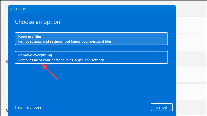 - In the pop-up that appears, click on 'Remove everything', which is recommended and can help you avoid problems during the reset process.