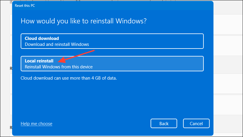 - Next, click on 'Local reinstall' to reinstall the OS using the files on your system. If you want to reinstall Windows with the latest updates, you can go with the 'Cloud download' option but it will require a fast and stable internet connection.