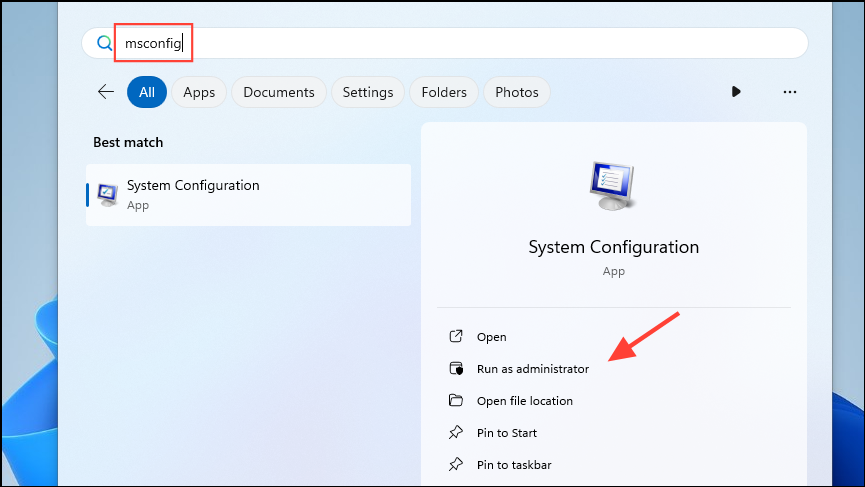 msconfigand click on 'Run as administrator'.