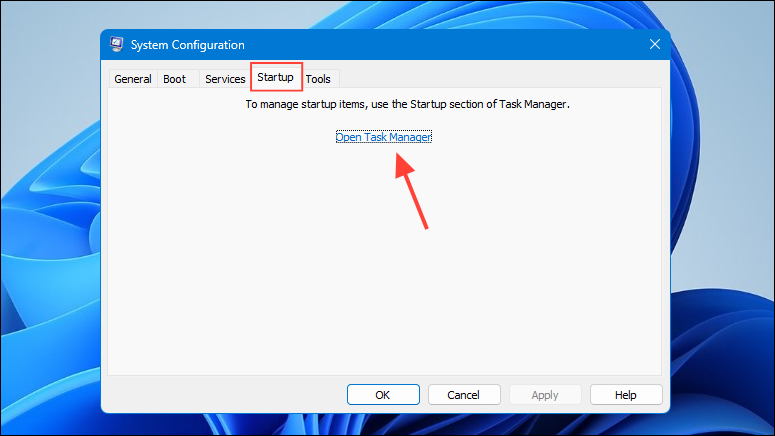 - Next, click on the 'Startup' tab at the top and then on 'Open Task Manager'.