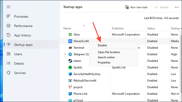 - When the Task Manager opens, right-click on each app on the right side one at a time and then click on 'Disable'.