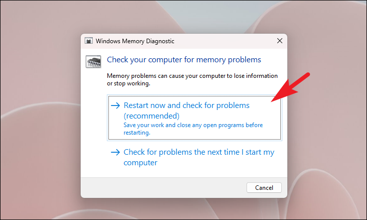 Step 2: In the Windows Memory Diagnostic window, click on Restart now and check for problems. Your computer will restart and begin the memory test.