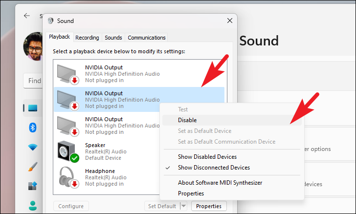 Step 4: In the Playback tab, right-click on any non-default audio devices and select Disable. Repeat this for all external audio devices except your default device.