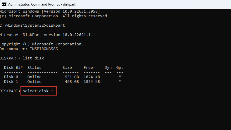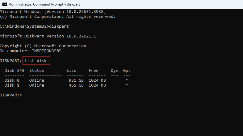list diskand press Enter to view all the disks connected to your PC. If your machine has a GPT disk, an '*' will appear below the GPT section.