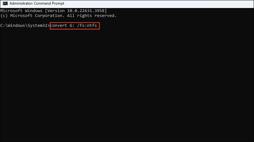 convert G: /fs:ntfsbefore pressing the Enter key. Replace 'G' with the letter of the drive you want to convert to NTFS.