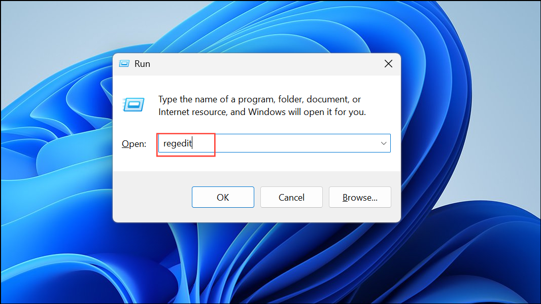 Step 1: Press Win + R to open the Run dialog, type regedit, and press Enter. If prompted by User Account Control, select Yes to proceed.