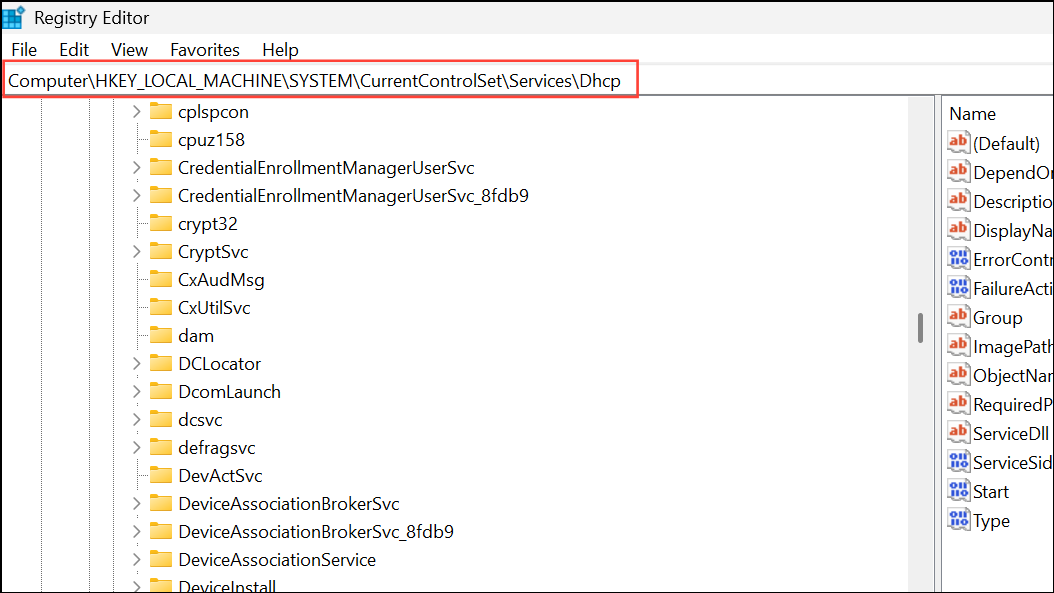 Step 2: In the Registry Editor, navigate to HKEY_LOCAL_MACHINE\SYSTEM\CurrentControlSet\Services\Dhcp.