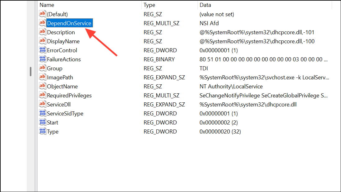 Step 3: On the right pane, locate DependOnService and double-click it. Remove all values except Afd. Click OK to save.