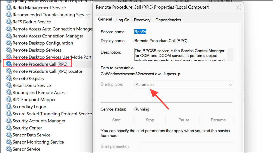Step 4: Repeat these steps for Remote Procedure Call (RPC) and DCOM Server Process Launcher. Both must be set to Automatic and running.