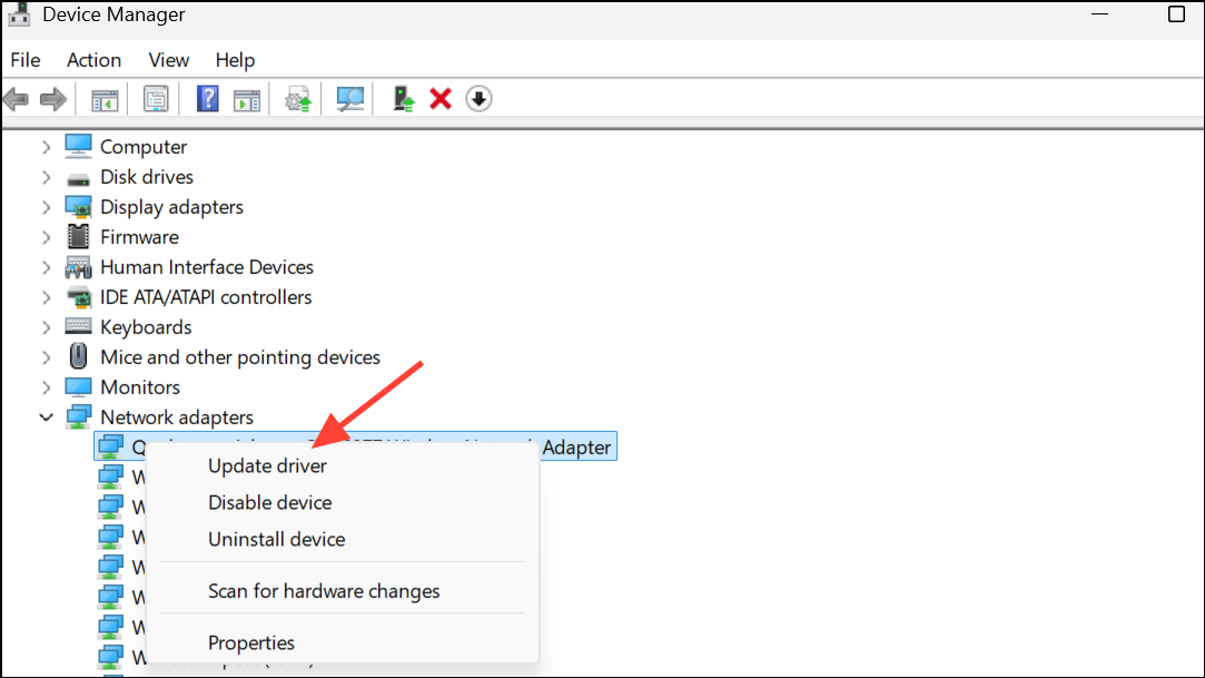Step 2: Expand Network adapters, right-click your wireless adapter, and select Update driver.