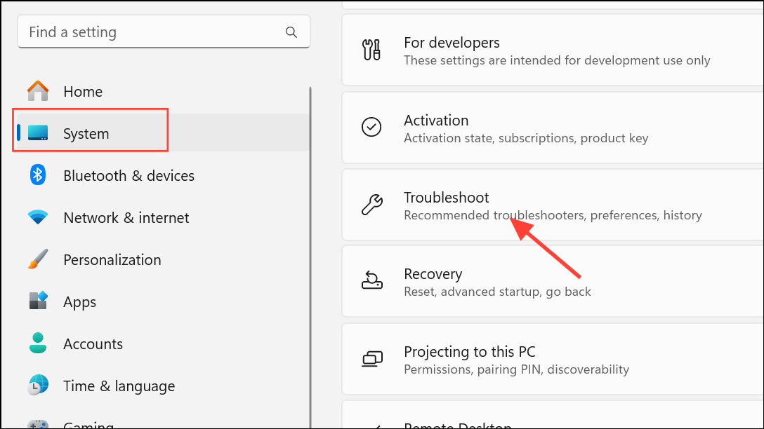 Step 1: Press Win + I to open Settings, then navigate to System > Troubleshoot.