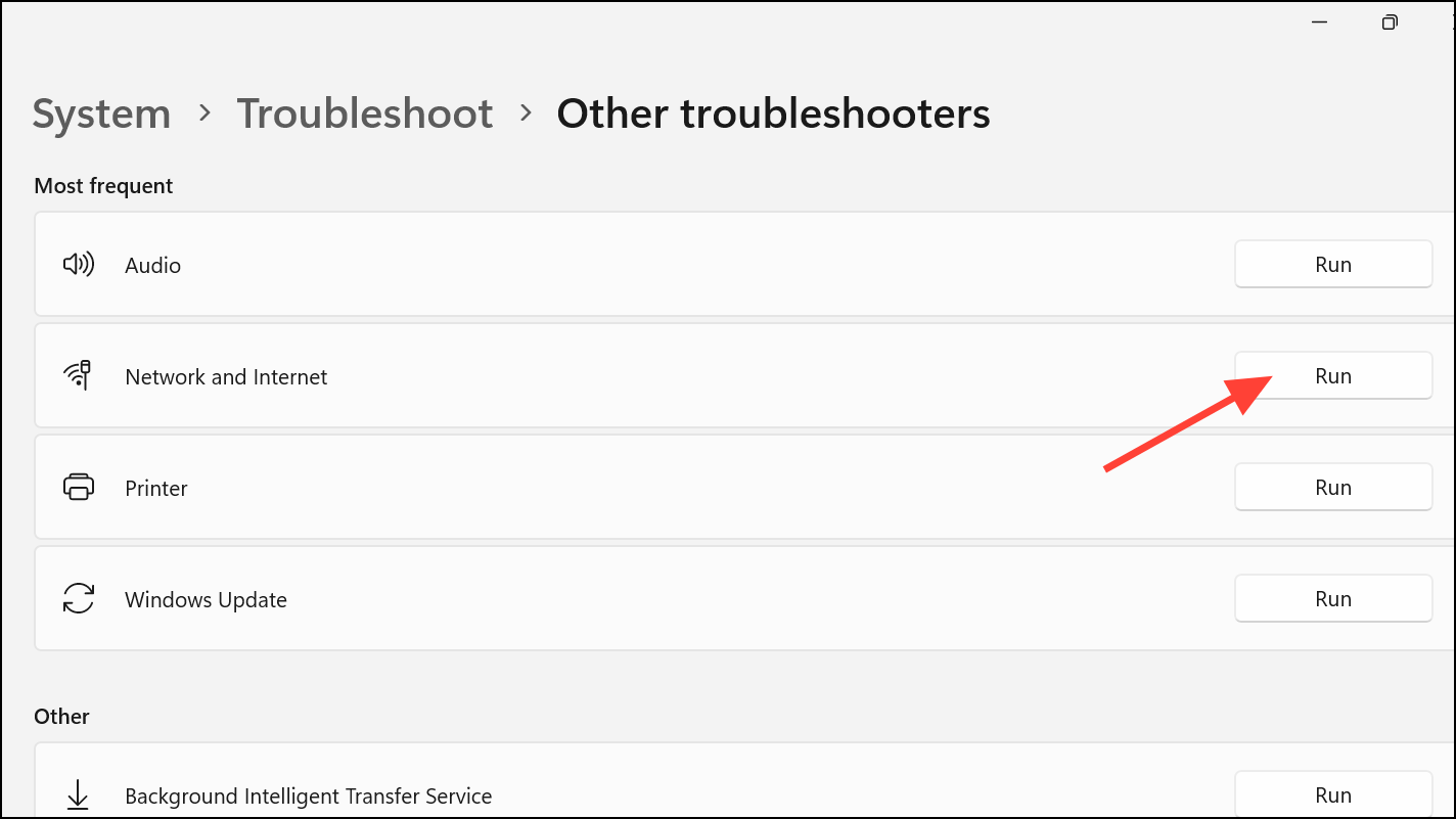 Step 2: Select Other troubleshooters, find Network and Internet, and click Run.