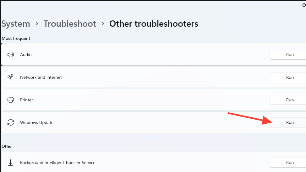 - On the next page, click on the 'Run' button on the right of the Windows Update option.