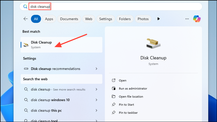 - Search for 'Disk Cleanup' in the Start menu or search box and click on it when it appears.