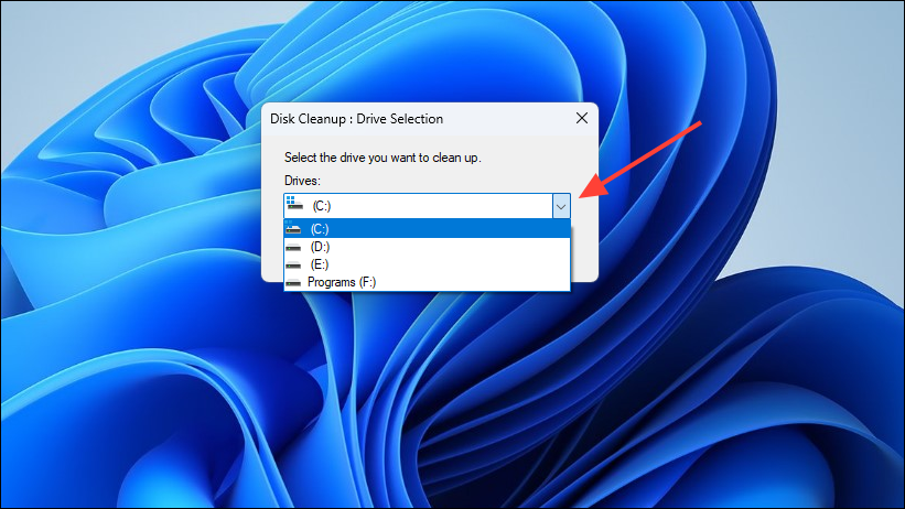 - The Disk Cleanup utility will first let you select the drive you want to clean up. Click on the arrow to access the drop-down menu which lists all the drives and click on the drive you want to select.