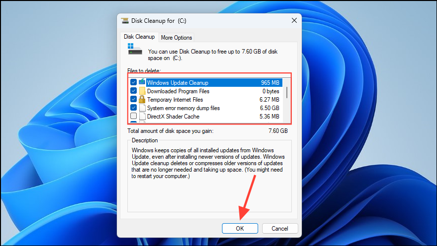 - Once you click on OK, a new dialog box will appear where you can choose the files to delete. Click on the checkboxes next to the ones you want to remove before clicking on the 'OK' button.