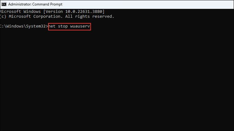 net stop wuauservbefore pressing the 'Enter' key.