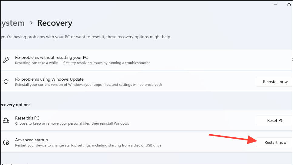 - Click on the 'Restart Now' on the right of the 'Advanced Startup' option.