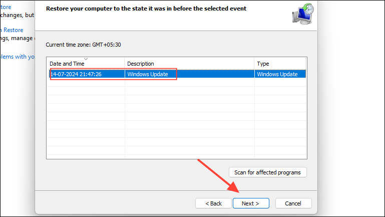 - On the next page, you will see all your previously created restore points. Click on the restore point you want to select and then click on the 'Next' button.