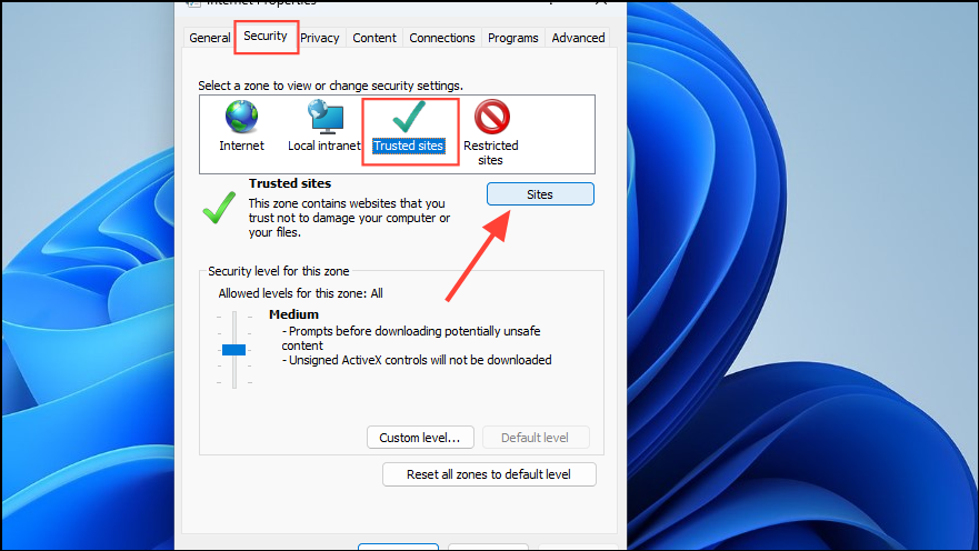 - When the Internet Options dialog box appears, go to the Security tab at the top, then click on 'Trusted Sites' before clicking on the 'Sites' button.