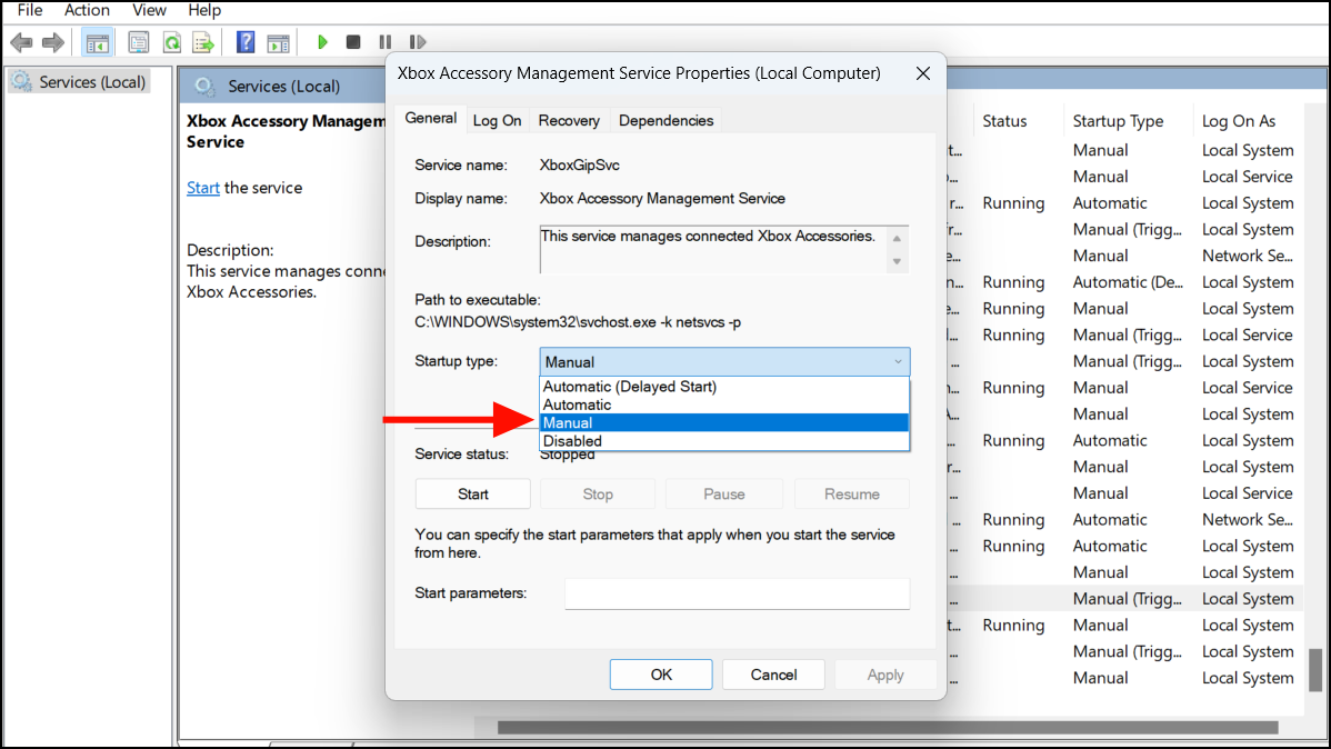 Step 3: In the Startup type dropdown menu, select Manual. If the service is not running, click Start. If it is running, click Stop and then Start to refresh it.