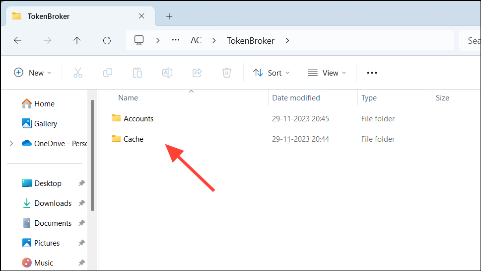 Step 2: In the TokenBroker folder, delete the Accounts and Cache folders.