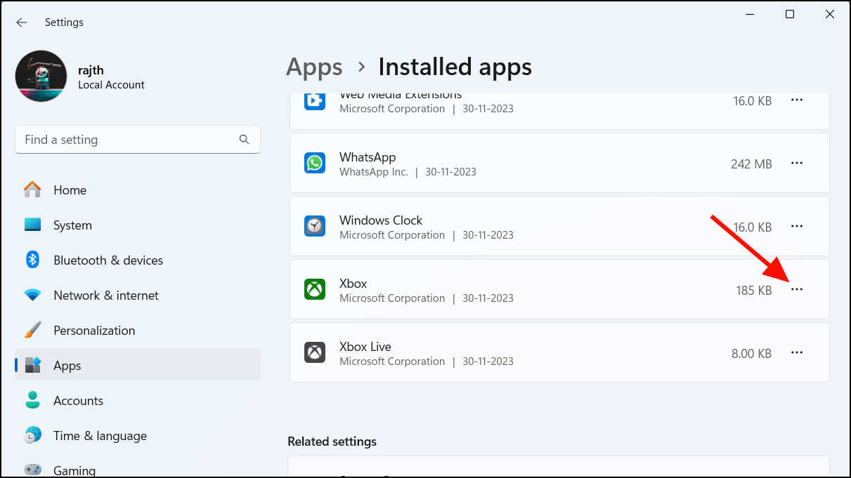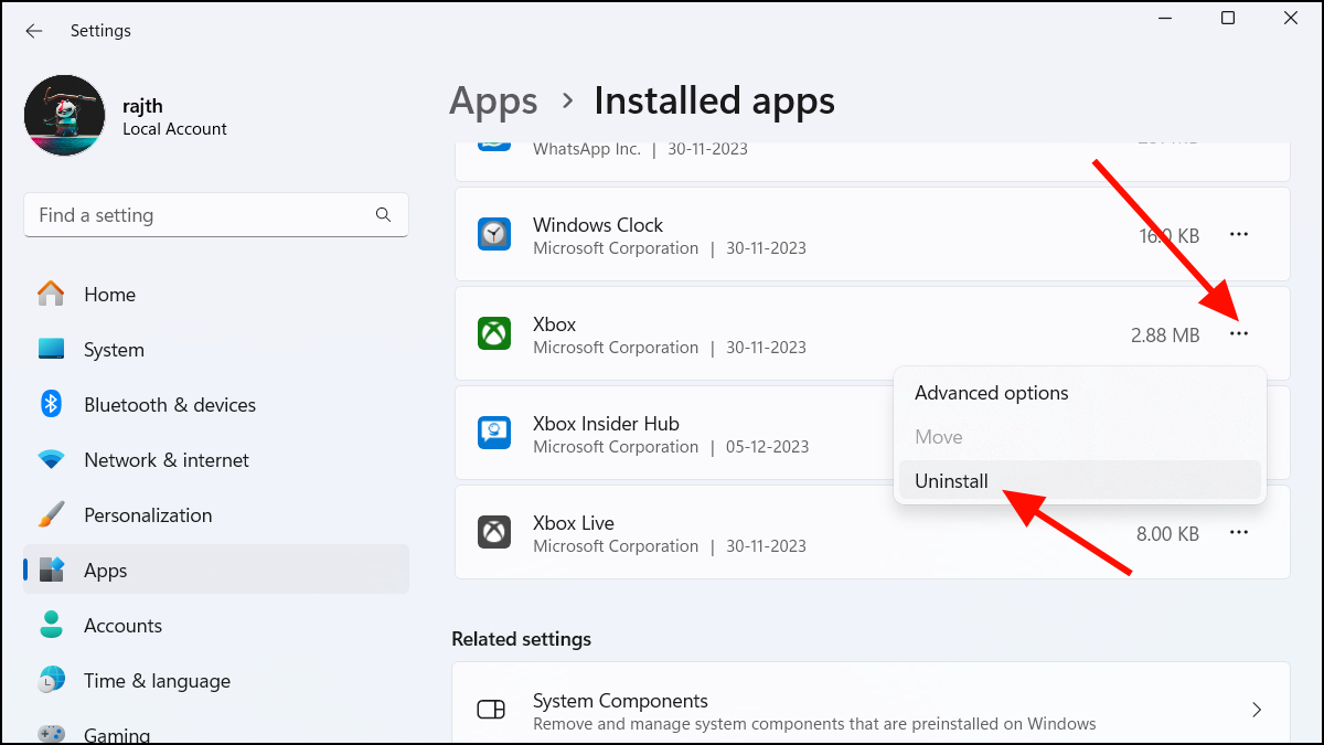 Step 2: Find the Xbox app, click the three-dot menu, and choose Uninstall. Confirm the uninstallation when prompted.