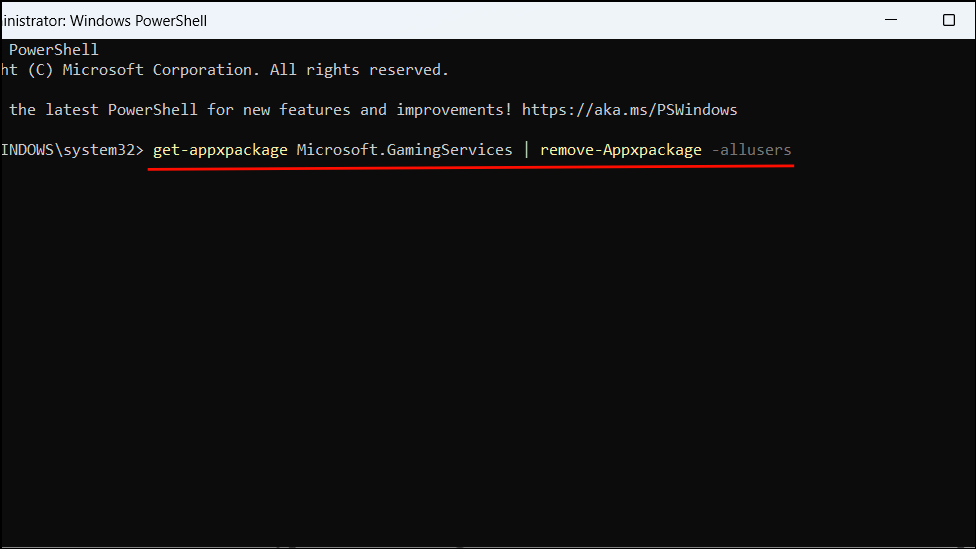Step 2: In the PowerShell window, type the following command and press Enter to remove the gaming services: